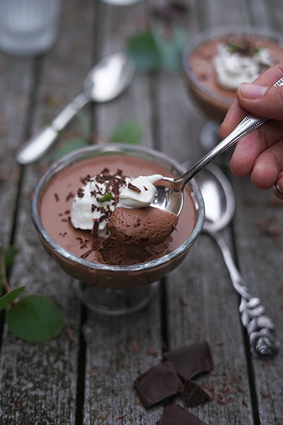 Das Mousse in eine Servierschüssel abfüllen oder in individuelle Gläser. Mindestens 4 Stunden kalt stellen. Ich mach es immer über die Nacht.